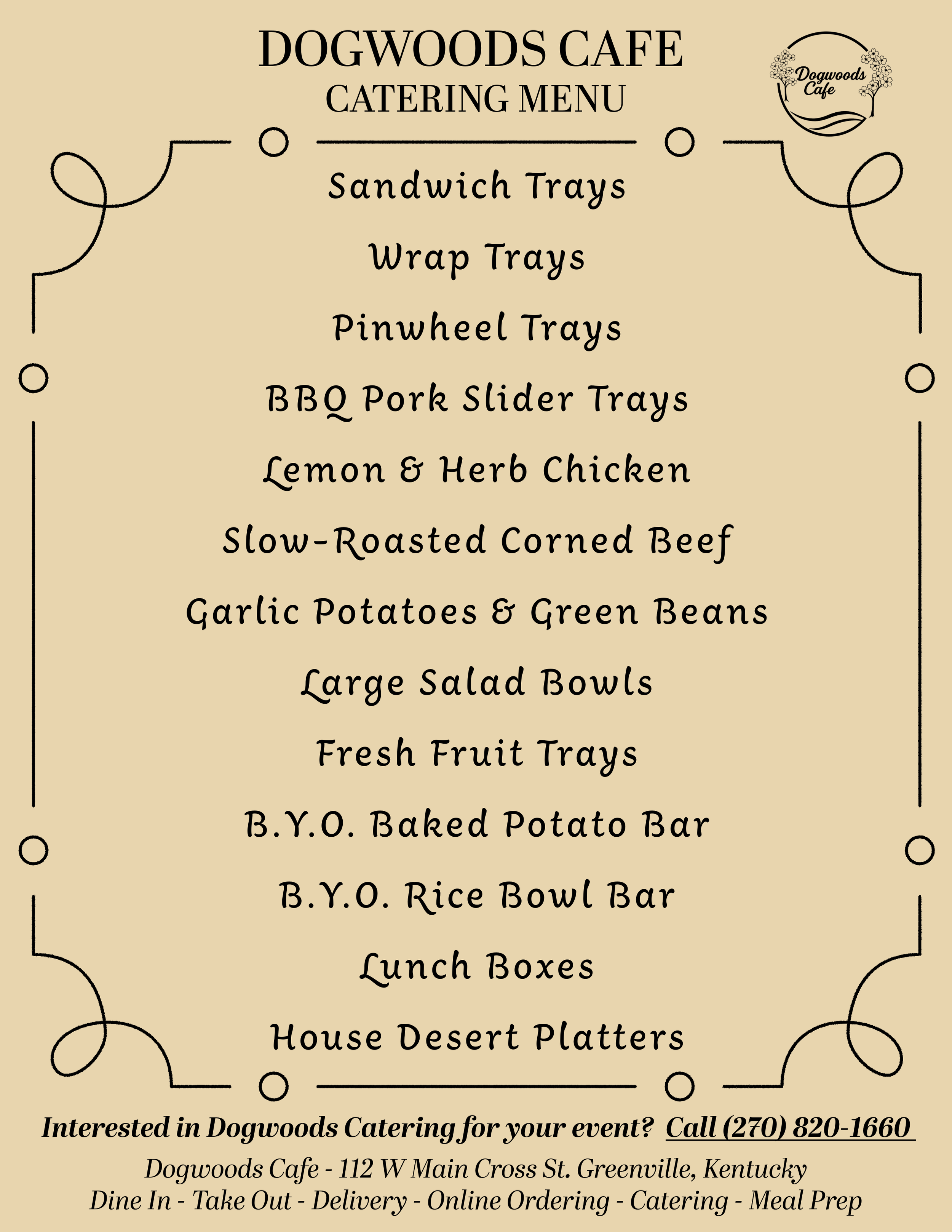 Dogwoods Cafe is here to provide custom catering to suit any event needs. We are happy to work with you to create a delicious assortment of sandwich or wrap platters, salads, fruit salads, and sweet treats.