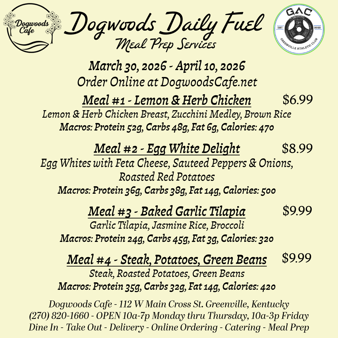 Greenville Athletic Club Members are eligible to receive an exclusive 10% discount on Dogwoods Daily Fuel Meals. ENTER PROMO CODE DURING CHECKOUT Please call GAC at 270-377-7134 if you have any questions.